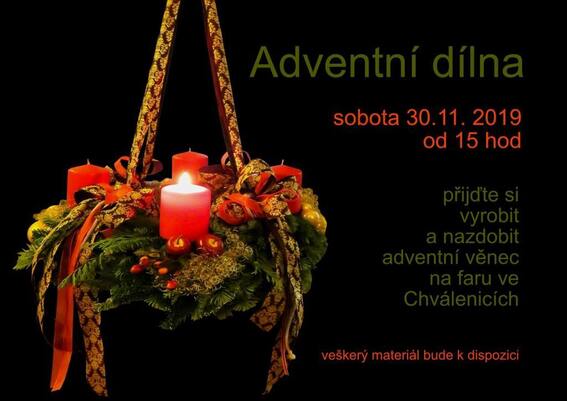 Přijďte do adventní dílny na faru do Chválenic. Tvořit budeme adventní věnce, zdobené větve, svícny, přání a další rozmanité dekorace.